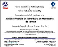 Por este medio tenemos el agrado de invitarle al próximo evento de Taiwan Trade Center Mexico City, Misión Comercial de la Industria de Maquinaria de Taiwán, llevará a cabo el Lunes 22 de Noviembre en la Cámara de Comercio de la Ciudad de México de 10:30 a 18:00 hrs.